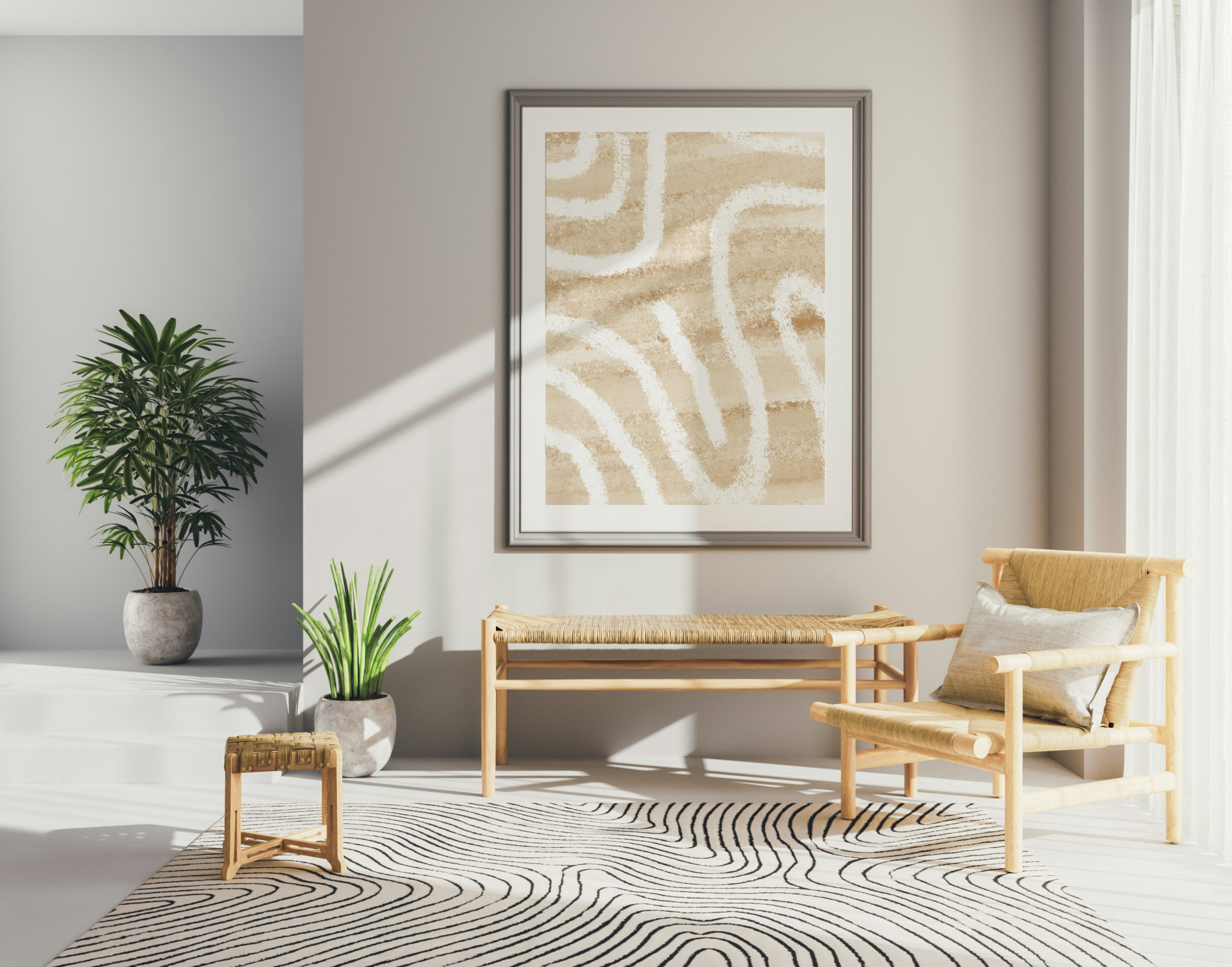 Das Poster misst 70 x 100 cm und ist auf Galeriepapier gedruckt, was eine matte und exklusive Oberfläche ergibt. Die Farben in Beige und Weiß machen es sowohl für helle als auch dunkle Innenräume geeignet, wo es als ruhiges, aber markantes Designelement fungieren kann.